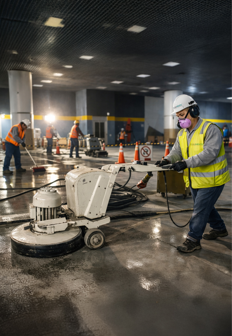 Pulimento avanzado para pisos de alto tráfico — transformamos tus superficies mediante desbaste, densificación y diamantado profesional, logrando pisos más resistentes, uniformes y estéticamente superiores.